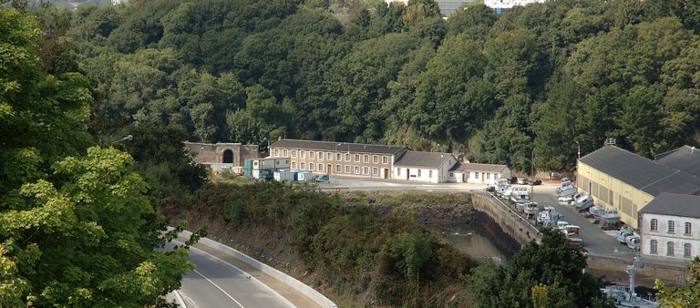 Vue du fond de la Penfeld : l'Arrière-garde. Porte monumentale reliée aux fortifications du Bouguen dit Fort BouguenImmatriculation