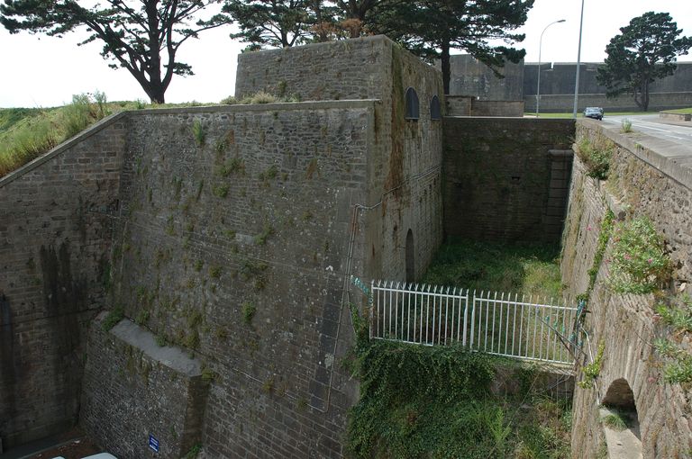 Vue des vestiges des fortifications d'agglomération de Brest : corps de garde percé de créneaux de fusillade flanquant la porte du Port de CommerceImmatriculation