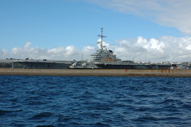 Vue de l'arsenal de Brest depuis la rade : le porte avion Clémenceau (R98 : désarmé le 1er octobre 1997, en attente de démolition. Appelé Q-790 depuis 2002.) dans l'attente de son démantèlementImmatriculation