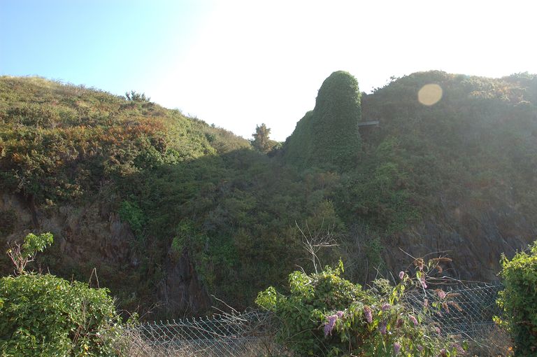 Vue de l'enceinte du fort de mer depuis le chemin côtier : fossé sec envahi sous la végétationImmatriculation