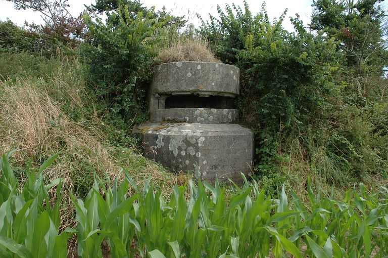 Vue de l'ensemble fortifié situé à l'ouest de Plougonvelin de part et d'autre de la Départementale n° 85 : marquage du poste d'observation dit Tobrouk sous masque orienté vers l'ouestImmatriculation