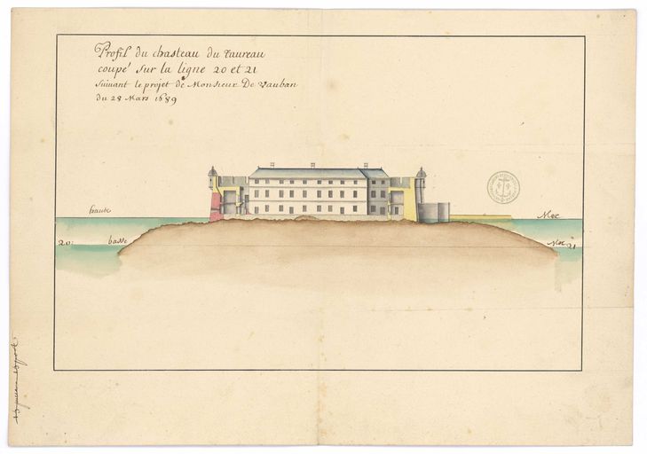 Profil du château du Taureau coupé suivant la ligne 20 et 21 suivant le projet de monsieur de Vauban, rez-de-chaussée, 28 mars 1689Immatriculation