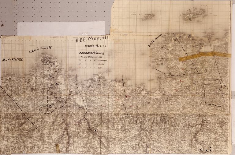 Carte de situation au 15 janvier 1944 du groupe défensif côtier (Küstenverteidigungsgruppe, en abrégé KVG) de Morlaix et de ses deux sous-groupes (Küstenverteidigungs unter Gruppe, en abrégé KVGU) avec leurs ensembles fortifiés de Louannec à Cléder (Widerstandsnest et Stützpunkt : Heer, Luftwaffe, Marine, Gast)Immatriculation