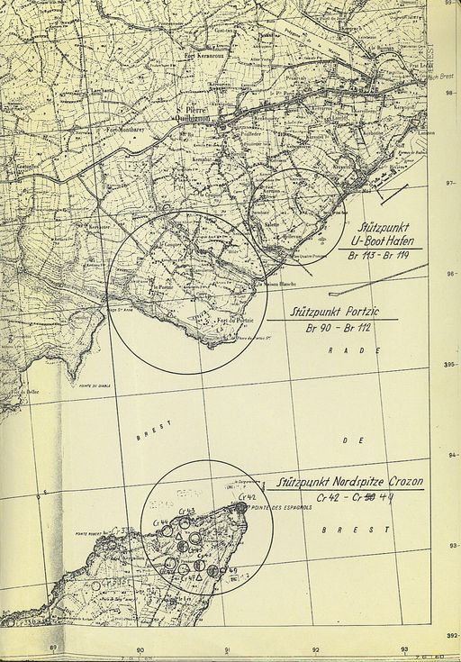 Carte allemande des ensembles fortifiés du groupe défensif côtier de Crozon codé Cr (Cr 42 - 50 : Stützpunkt Nordspitze Crozon) et de la Festung Brest (B 90 - 112 : Stützpunkt Portzic ; B 113 - 119 : Stützpunkt U-Boot Haffen ; etc.)Immatriculation
