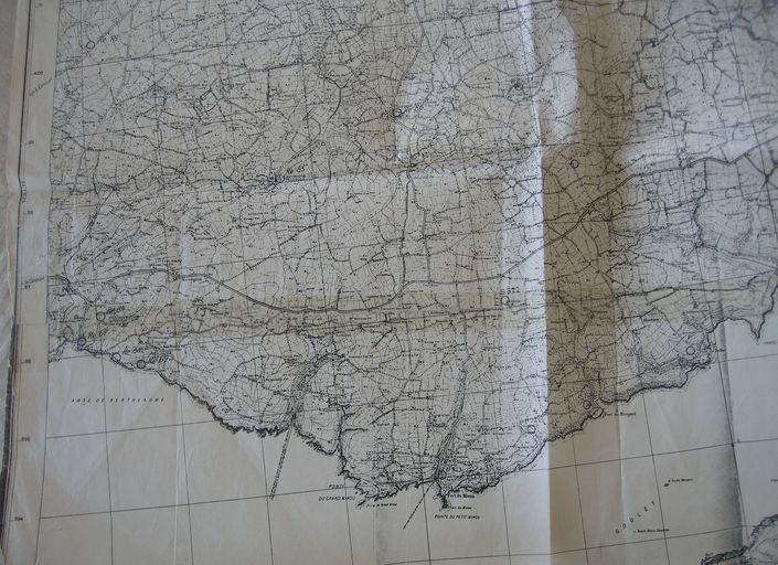 Carte allemande des ensembles fortifiés du groupe défensif côtier de Saint-Renan codé Re (Re 67 - 69 ; Re 78 ; Re 84 - 86 ; Re 310 ; Re 312 - 313) et de la Festung Brest codée B (B 318 - 322)Immatriculation