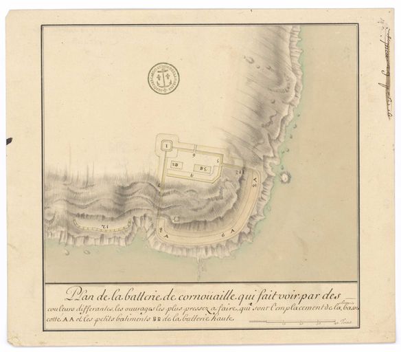 Plan du projet de la batterie de Cornouaille (escarpement, projet de branches tombantes, de batterie haute et de tour-réduit) et de Beaufort pour montrer les ouvrages les plus pressés à faire, 1684 (?) par MollartImmatriculation