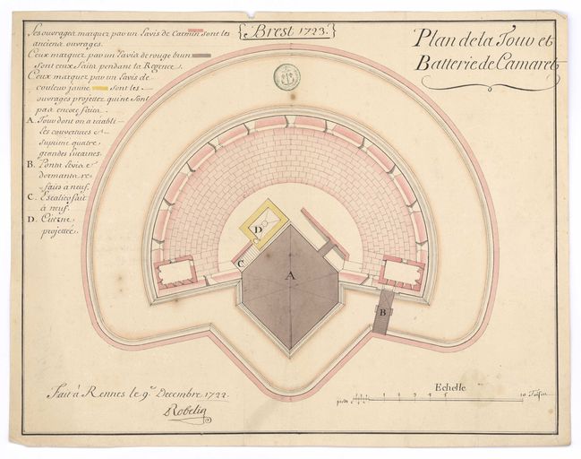 Plan de la tour et de la batterie de Camaret, projet de citerne, fait à Rennes le 9 décembre 1722 par RobelinImmatriculation