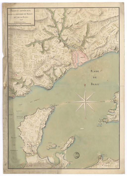 Collection Nivart. MS144_200. Projets généraux pour la défense de Brest et de la rade. Ouvrages proposés par M. de la Rosière et par MM. Filley et Dajot.Plan, support papier, 0,454 x 0,629 mètre, 3e quart 18e siècle, 1772.