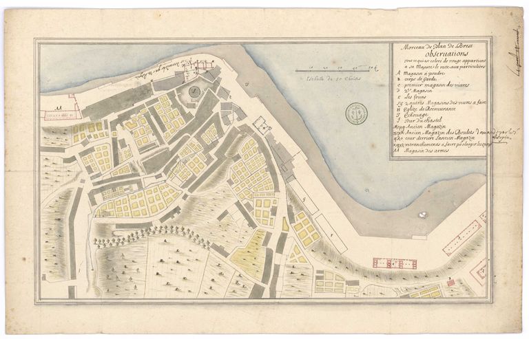 Plan partiel du quartier de Recouvrance montrant ce qui appartient au Roi : magasin à poudre, corps de garde, magasins des vivres, les fours etc. Envoyé par M. de Seuil. 16 janvier 1682Immatriculation