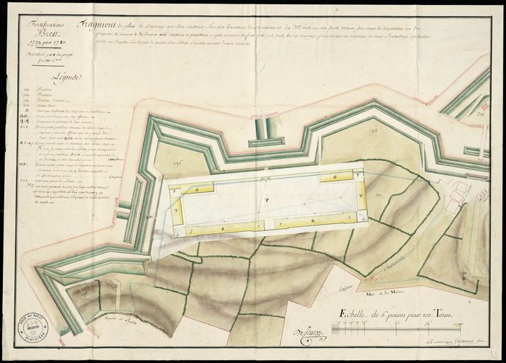 Fortifications de Brest, 1779 pour 1780 : plan partiel de l'ouvrage construit sur les hauteurs du Bouguen et du Menès, projet de casernes, cour et pavillons pour loger un régiment de deux bataillons d'infanterie. Le 4 novembre 1779, par De CauxImmatriculation