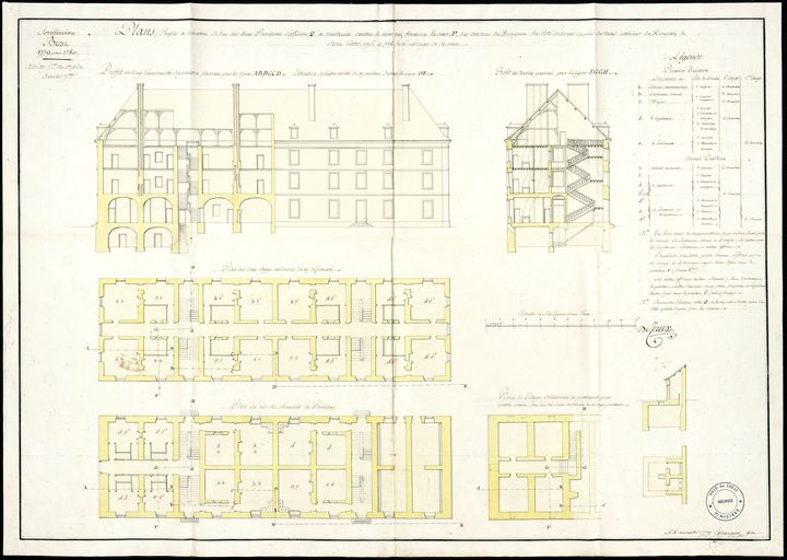 Fortifications de Brest, 1779 pour 1780 : plans, profils et élévation d'un des deux pavillons d'officiers projetés pour loger un régiment de deux bataillons d'infanterie sur les hauteurs du Bouguen et du Menès. Le 4 novembre 1779, par De CauxImmatriculation