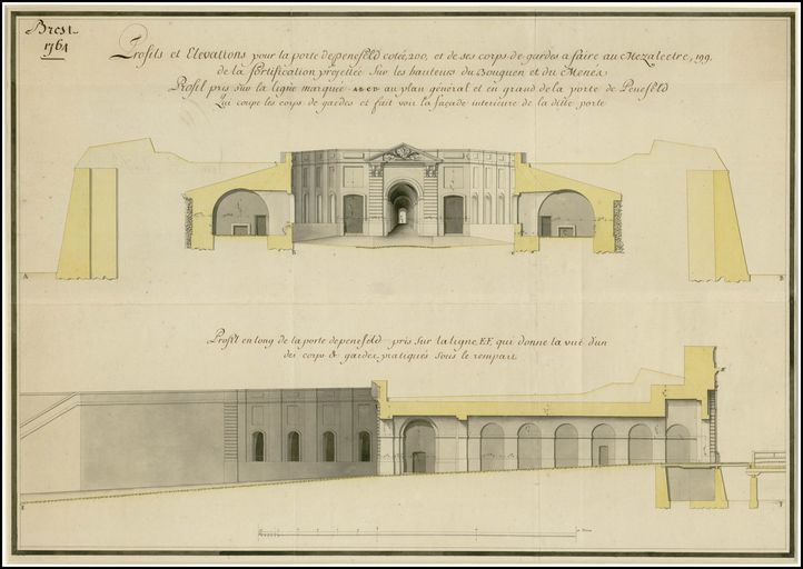 Brest, 1764 : profils et élévations pour la porte de Penfeld (cotée 200) et de ses corps de garde à faire au mézalectre (199) de la fortification projetée sur les hauteurs du Bougen et du Menès, par Pierre Filley de la CôteImmatriculation