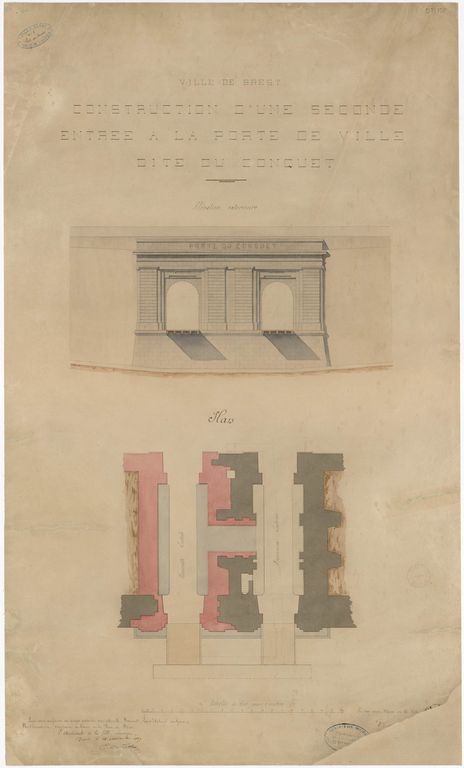 Elévation extérieure et plan d'une seconde entrée à la porte de ville dite du Conquet, Ville de Brest, 28 novembre 1867 par l'architecte de la villeImmatriculation