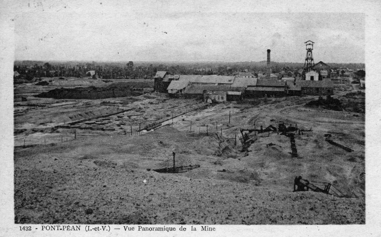 Vue sur les laveries (round buddles) de la Mine, durant les années 1930, aujourd'hui pour la plupart recouvert d'un remblai, (Coll. Part., Jean-Pierre Cudennec, Pont Péan)Immatriculation