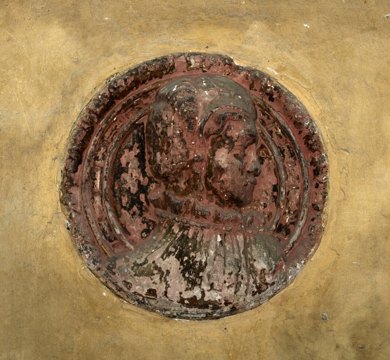 Vue intérieure, cheminée de la salle, décor, médaillon de henri IIImmatriculation