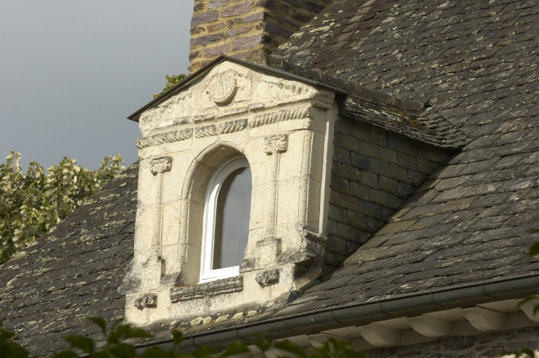 La façade principale : détail d'une lucarne présentant une date portée en médaillonImmatriculation