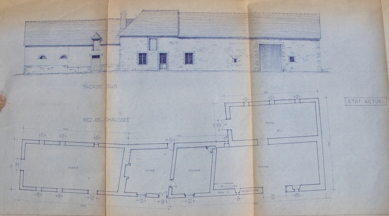 Etat actuel, façade sud et plan du rez-de-chaussée, par Patrick Caillemer, 1986 (A.Privées)Immatriculation