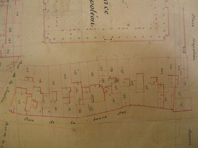 Plan cadastral de 1844 : section K, détail rue du Pot d'Etain. AM Vannes 21Fi.Immatriculation