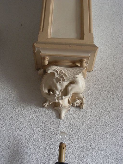 Hall d'entrée, détail des consoles figurées supportant les arcades.Immatriculation