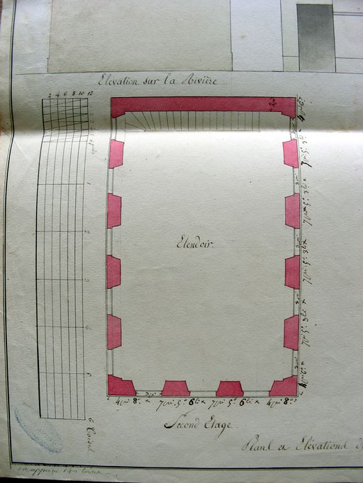 Moulin à papier à établir rue du Roulage pour M. Le Vanier, plans et élévations par Brunet-Debaines, sd (1821), détail : plan du second étage : étendoir. AD Morbihan, 5M 230.Immatriculation