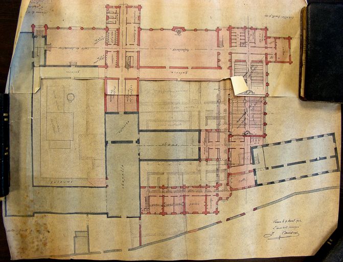 Projet d'agrandissement du Grand Séminaire par J. Caubert de Cléry, 1912 : plan du rez-de-chaussée, variante avec avancée façade est. Archives de l'Evêché de Vannes Y5.Immatriculation