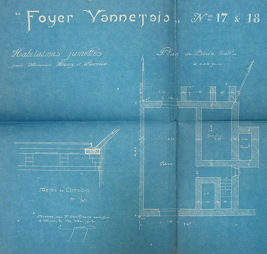 Plans des maisons Henry et Puireux : plans des caves par E. Germain, 13 mai 1913. AM Vannes 5I162.Immatriculation