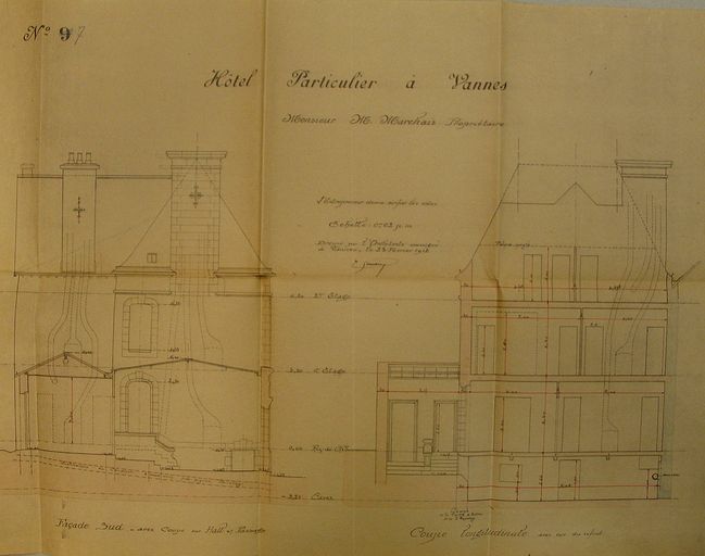 Elévation façade sud et coupes par E. Gemain, 1912. AM Vannes 5I162.Immatriculation