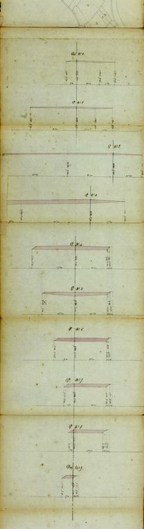 Profils en travers de la vallée du Coron (dite de l'Enfer), en vue de l'accroissement des réserves alimentaires du bief de partage de Glomel, 1876 : profils 0 à 9 (DDE Morbihan, Pontivy)Immatriculation