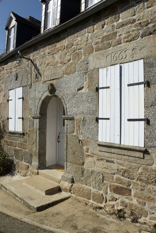 Lanvellec, Goaz Arou : maison, façade antérieure orientée vers le sud, porte en arc plein cintre et fenêtre portant le millésime 1665Immatriculation
