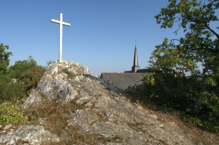 Vue générale : croix de mission, église paroissiale et maisons du bourg depuis le gisement de quartz (2009)Immatriculation