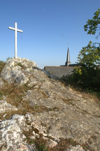 Vue générale : croix de mission, église paroissiale et maisons du bourg depuis le gisement de quartz (2009)Immatriculation