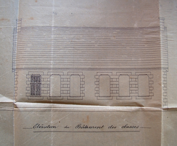 Plan de détails du bâtiment à usage de classes de l'école dressé le 20 décembre 1883 par l'agent-voyer principal Kerbrat, élévation antérieure sur rue (AD 22)Immatriculation