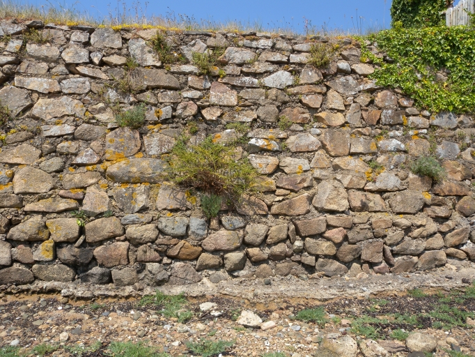 Vue de détail des moellons maçonnés de la digue, côté Sud-Ouest : remarquer le fruit du mur et le léger renflementImmatriculation