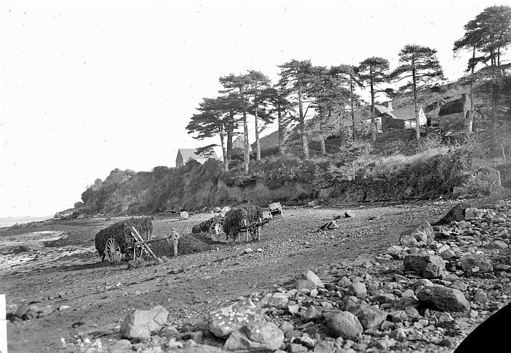 Vue d'une scène de chargement de gémons au pied de l'île, avec les anciens bâtiments de la ferme, cachée derrière une haie d'arbres, 1er quart 20ème siècle (collection particulière)Immatriculation