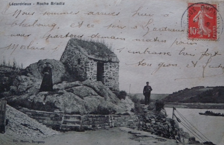Vue de l'emplacement de l'atelier de transmission et de veille des Phares et Balises aujourd'hui : Roc'h Briadis (carte postale, collection particulière)Immatriculation