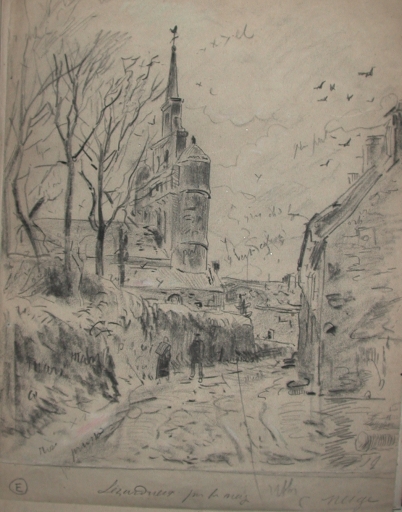Dessin de Faudacq : la côte qui mène depuis le port au bourg de Lézardrieux, sous la neige, 3ème quart 19ème siècle, avec l'ancien mur (collection particulière)Immatriculation