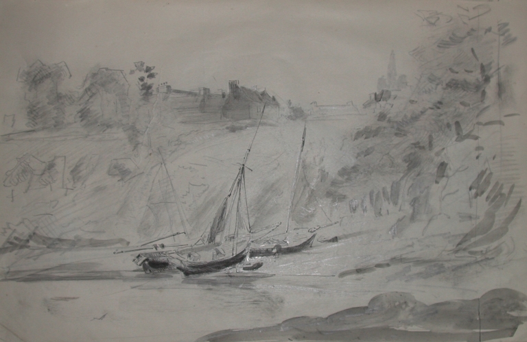 Dessin de Faudacq : échouage de gabarres au fond du port, au niveau du Prostern, fin 19ème siècle (collection particulière)Immatriculation