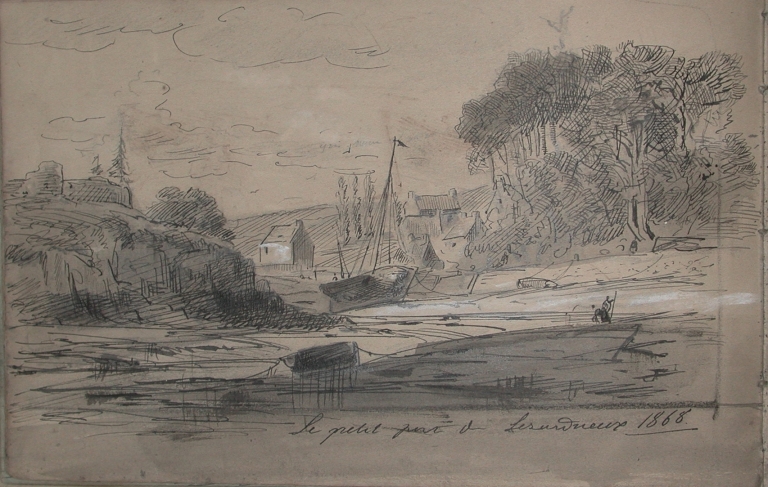 Dessin de Faudacq : échouage de gabarres au fond du port, au niveau du Prostern, 1868 (collection particulière)Immatriculation