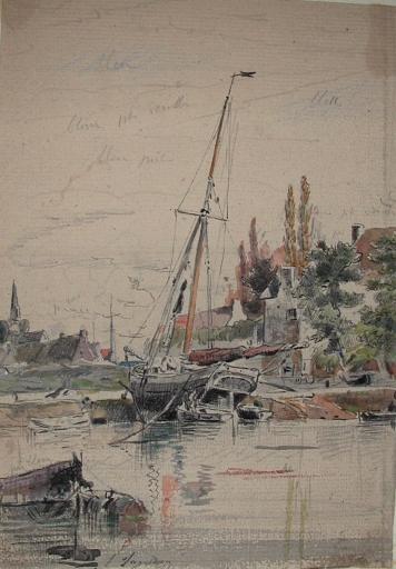 Dessin aquarellé de Faudacq : échouage d'un caboteur au niveau des anciens quais, fin 19ème siècle (collection particulière)Immatriculation