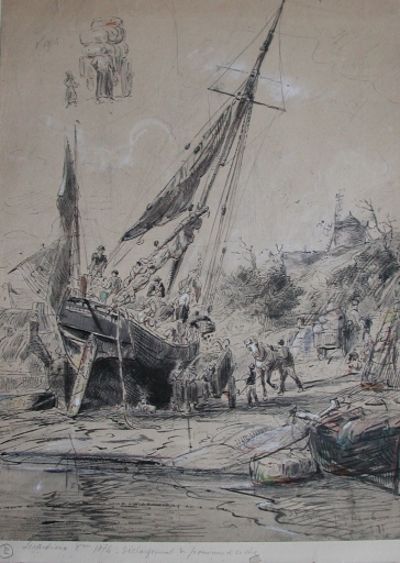Dessin de Faudacq : déchargement de pommes à cidre, 1874 (collection particulière)Immatriculation