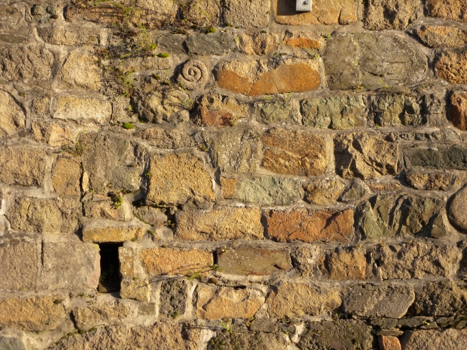 Vue de la forme de triskell sculptée dans une pierre du murImmatriculation
