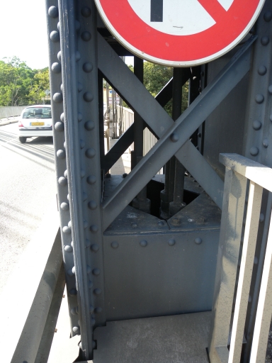Vue de détail de la base en fer rivetée d'un pylôneImmatriculation