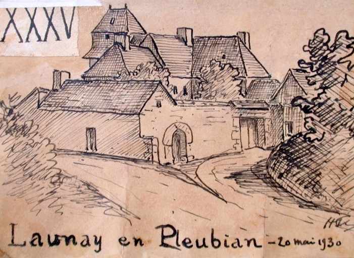 Le Launay, vue générale du manoir, croquis à la plume d'Henri Frotier de la Messelière, 20 mai 1930 (AD 22)Immatriculation