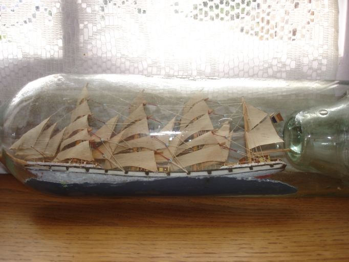 Maquette de bateau en bouteille : quatre mâts barque long courrier,