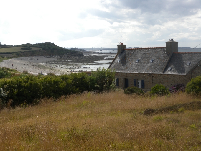 Vue d'un habitat traditionnel au niveau du cordon de galets (sous le promontoire) et de la falaise quaternaire de Crec'h CostiouImmatriculation