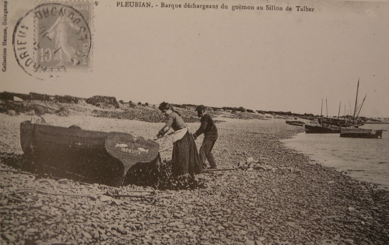 Vue d'un petit canot goémonier échoué sur le front Est du Sillon, couvert de meule de goémons, 1er quart 20ème siècle (carte postale, collection particulière)Immatriculation