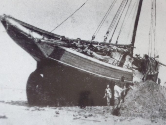 Vue de la 'Petite Anna' à l'échouage pour prendre du sable à la pelle, près de Nuellan, 'Petite Grève du Sillon de Talbert' (collection particulière)Immatriculation