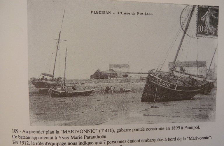 Au 1er plan : la 'Marivonnic' (T 410), gabarre pontée construite en 1899 à PL, à Yves-Marie Paranthoën et 'Notre Dame de Bon Secours' (T 425), construit en 1907, à l'usine, patron Pierre Marie Le Bideau (collection particulière)Immatriculation