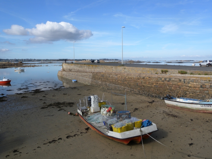 Vue générale du port à marée basse avec les engins de pêche des deux derniers marins-pêcheurs professionnels de PleubianImmatriculation