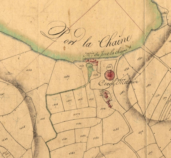 Extrait du cadastre de 1829 : le moulin à eau de Port-la-Chaîne : B 3ème feuille 121-62-63 et le moulin à vent associé de Crec'h Melquin : B 1266 (AD 22)Immatriculation